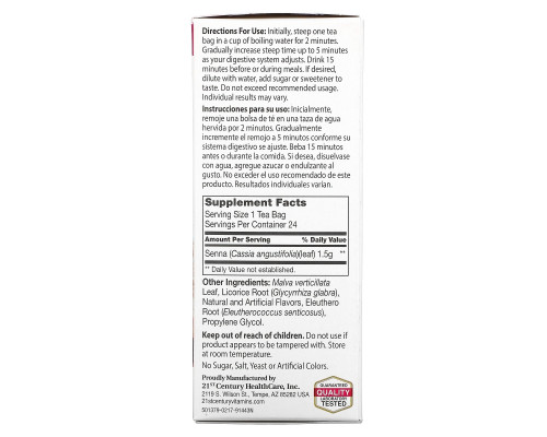 Notice: This product contains Senna leaves. Read and follow directions carefully. Do not use if you have or develop diarrhea, loose stools, or abdominal pain. Consult your physician if you have frequent diarrhea. If you are pregnant, nursing, taking medication or have a medical condition, consult your physician before using this product.