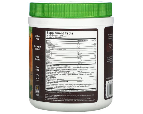 | Amazing Grass Green Food Blend Organic Wheat Grass, Organic Barley Grass, Organic Alfalfa, Organic Spirulina, Organic Spinach, Organic Chlorella (cracked cell-wall), Organic Broccoli | 5535 mg | |