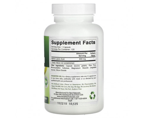 Компоненты добавки Антиоксиданты Best Naturals, Alpha Lipoic Acid, 600 mg, 120 Capsules