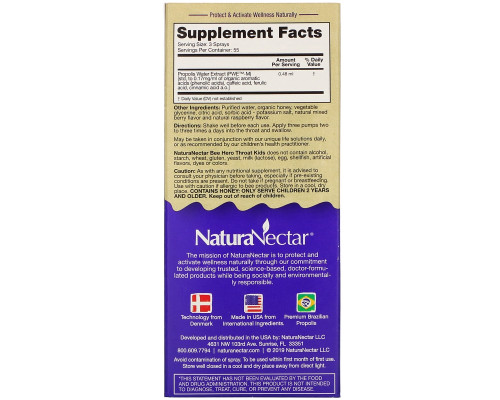 Компоненты добавки NaturaNectar, Bee Hero Throat Kids, Natural Propolis Spray, Berry Blast, 30 ml