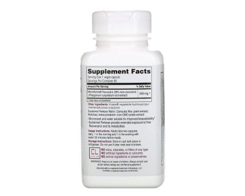 | Trans-resveratrol (98+% Trans-resveratrol) | 500 mg | N/A |