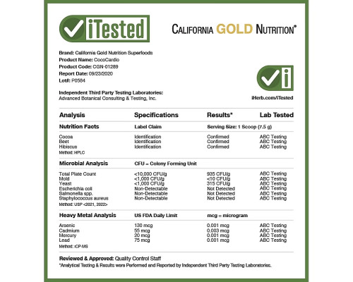 Компоненты добавки California Gold Nutrition, CocoCardio, Certified Organic Instant Dark Cocoa Beverage with Beet Juice & Hibiscus, 7.93 oz (225 g)