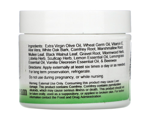 External use only. Consuming this product may cause Liver damage. This product contains Comfrey. Comfrey contains pyrrolizidine alkaloids, which may cause serious illness or death. This product should not be taken orally, used as a suppository, or applied to broken skin. For further information contact the Food and Drug Administration.
