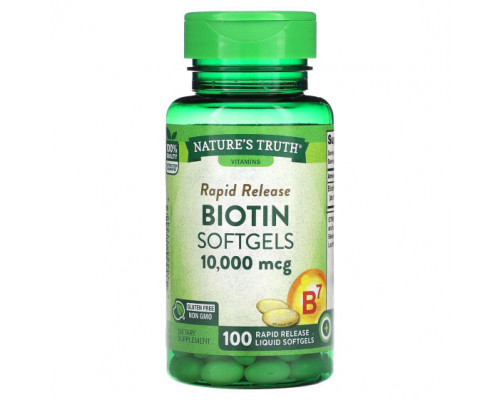 100 шт.Описание добавки Для здоровья кожи Nature's Truth, Биотин, 10 000 мкг, 100 желатиновых капсул с быстрым высвобождением