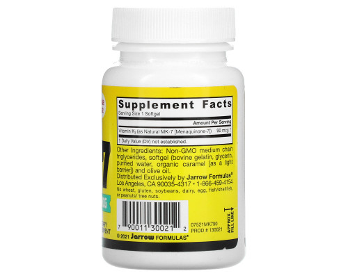 Jarrow Formulas® MK-7 is naturally made via fermented by Bacillus subtilis subsp. natto and is much better absorbed than K1 from spinach. MK-7 is a longer-acting form of vitamin K vs. K1 and MK-4, and better supports carboxylation of specific proteins needed to build bones and support cardiovascular health.