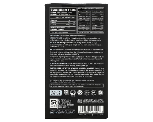 Описание добавки Sports Research, Коллагеновые пептиды, без вкусовых добавок, 20 пакетиков (по 11 г) каждый
