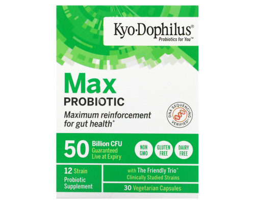 Kyo-Dophilus® Max Probiotic contains a community of 12 beneficial bacteria to help repopulate your microflora. This formulation includes The Friendly Trio®, a proprietary blend of biocompatible human strains Lactobacillus gasseri KS-13, bifidobacterium bifidum G9-1, and Bifidobacterium longum MM-2. Max Probiotic also includes L. acidophilus, L. plantarum, B. breve, B. infantis and L. rhamnosus along with other species.