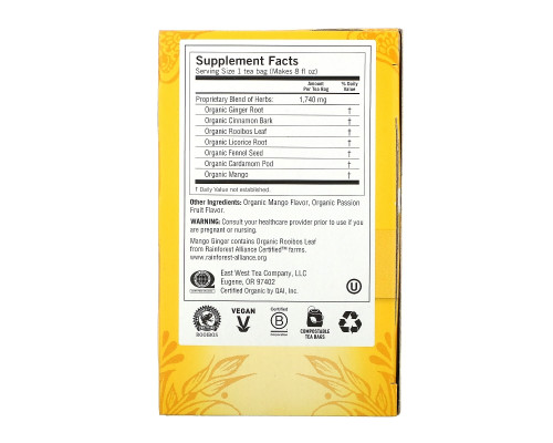 Манго-имбирь содержит органические листья ройбуша с ферм, сертифицированным Альянсом тропических лесов.