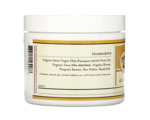 Organic extra virgin olea europaea (olive) fruit oil, organic cera alba (beeswax), organic honey, propolis extract, bee pollen, royal jelly.