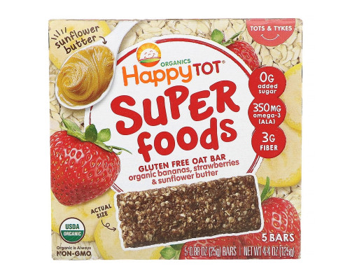 5 шт.Описание добавки Happy Family Organics, Organics Happy Tot, суперпища, безглютеновый овсяный батончик, органические бананы, клубника и подсолнечная паста, 5 батончиков, 25 г каждый
