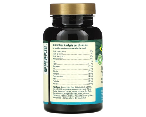 Сухие пивные дрожжи, мальтодекстрин, сухая сыворотка, стеариновая кислота, микрокристаллическая целлюлоза, сушеный чеснок, диоксид кремния, стеарат магния, глюконат железа, оксид цинка, глюконат меди, сульфат марганца, ниацин, d-пантотенат кальция, рибофлавин, тиамина мононитрат, биотин, пиридоксина гидрохлорид, фолиевая кислота, добавка с витамином B12.