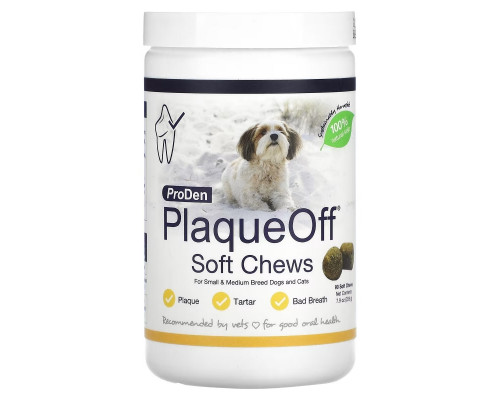 Описание добавки ProDen, PlaqueOff, мягкие жевательные таблетки, для собак и кошек мелких и средних пород, 90 жевательных таблеток, 225 г (7,9 унции)
