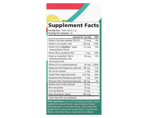 Лимонная кислота, фруктоолигосахариды, натуральный порошок из плодов малины (ароматизатор), натуральный ароматизатор «малина», экстракт листьев стевии, экстракт архата (плоды), натуральный порошок из плодов лимона (ароматизатор), натуральный порошок лайма (ароматизатор), натуральный ароматизатор «лимон», натуральный ароматизатор «лайм», натуральный ароматизатор «ягоды асаи».