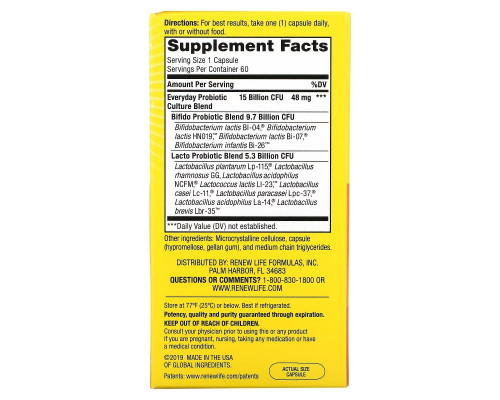 Способ приёма, инструкция применения добавки Renew Life, Ultimate Flora Everyday Probiotic, 15 Billion CFU, 60 Vegetarian Capsules