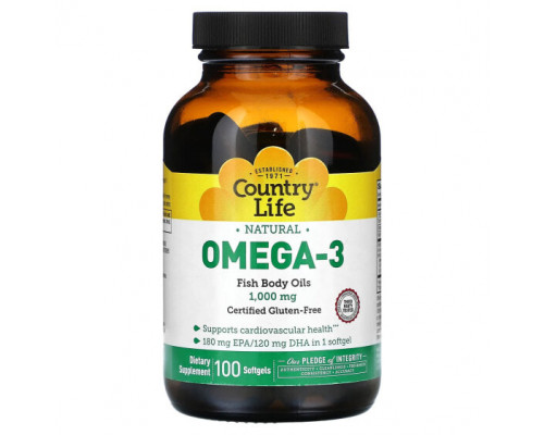 Рыбий жир из холодноводных рыб содержит омега-3 жирные кислоты. Добавка «Омега-3» от Country Life содержит в общей сложности 1000 мг рыбьего жира, включая 180 мг ЭПК и 120 мг ДГК в 1 капсуле. Потребление омега-3 жирных кислот поддерживает здоровье сердечно-сосудистой системы.