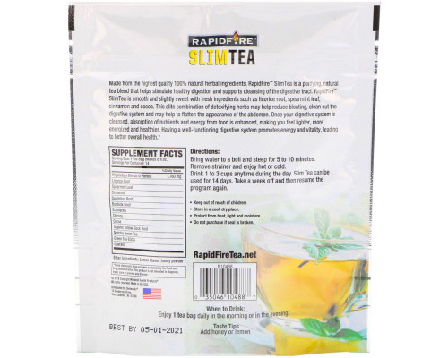 Описание добавки RAPIDFIRE, SlimTea, 14 Day Herbal Teatox, Matcha Tea, Real Lemon Flavor, 14 Tea Bags