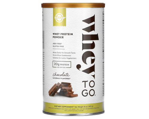 Описание добавки Solgar, Whey To Go, сывороточный белок, с натуральным шоколадным вкусом, 16 унций (454 г) порошка
