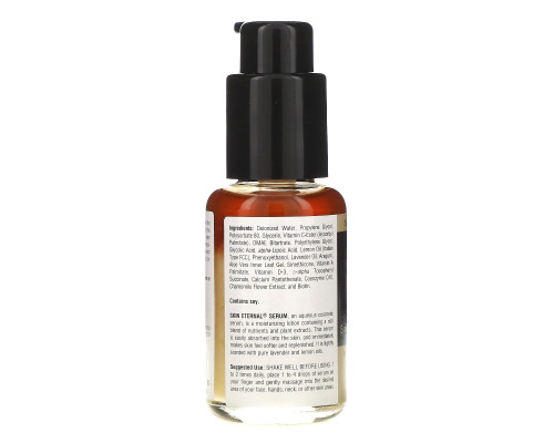 Сыворотка Skin Eternal Serum, водная косметическая сыворотка -это увлажняющий лосьон, содержащий в себе богатую смесь питательных веществ и растительных экстрактов. Эта сыворотка легко впитывается в кожу, делая ее более мягкой и обновленной. Продукт обладает легким ароматом лавандового и лимонных масел.