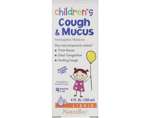 4 жидких унцийОписание добавки NatraBio, Средство от кашля с отхаркивающим действием для детей, ягодный вкус, 120 мл (4 жидк. унции)