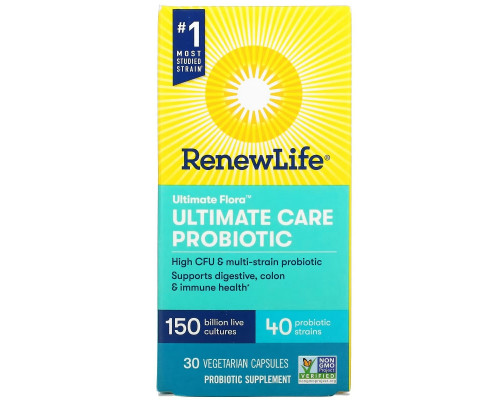 30 шт.Описание добавки Renew Life, Ultimate Flora, Ultimate Care Probiotic, 150 Billion Live Cultures, 30 Vegetarian Capsules