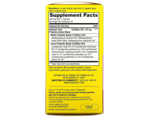 Описание добавки Renew Life, Ultimate Flora, Women's Care Probiotic, 25 Billion Live Cultures, 30 Vegetarian Capsules