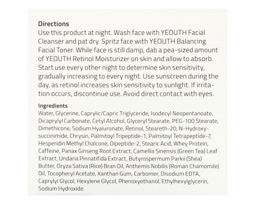 Описание добавки Yeouth, Увлажняющий крем с ретинолом и гиалуроновой кислотой, женьшенем и зеленым чаем, 30 мл (1 жидк. унции)