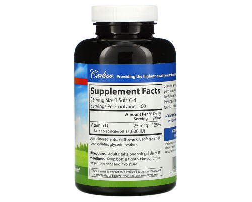 Компоненты добавки Carlson Labs, Vitamin D3, 25 mcg (1,000 IU), 360 Soft Gels