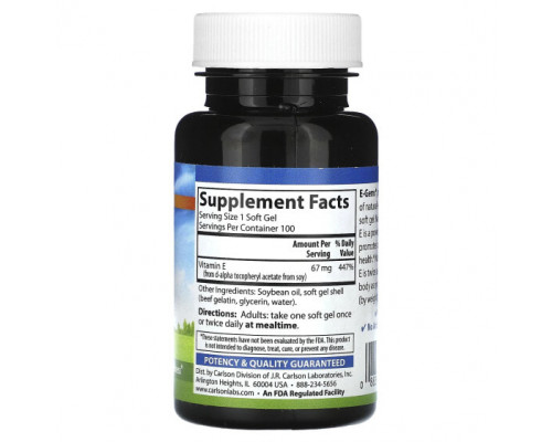 Способ приёма, инструкция применения добавки Витамин Е Carlson, E-Gems, 67 мг (100 МЕ), 100 мягких таблеток