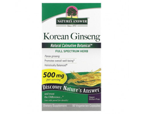 50 шт.Описание добавки Женьшень Nature's Answer, Корейский женьшень, 500 мг, 50 вегетарианских капсул